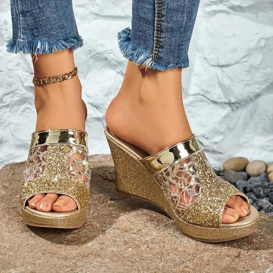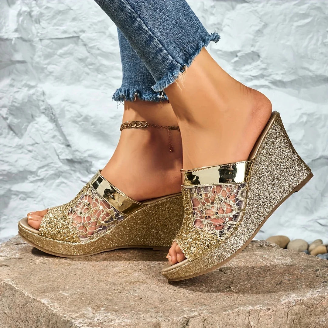 Dolgu topuk ve tabanı kaplayan ince sim katmanı, kıyafetinizi zahmetsizce bambaşka bir seviyeye taşır. Jean, elbise ya da abiyelerle kolayca kombinlenebilir; hem dikkat çeker hem de giyimi rahattır.