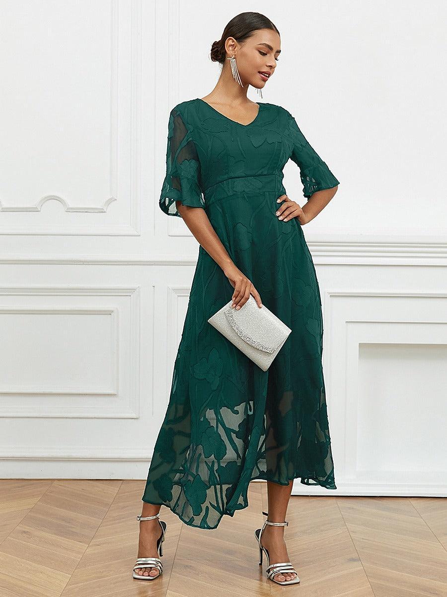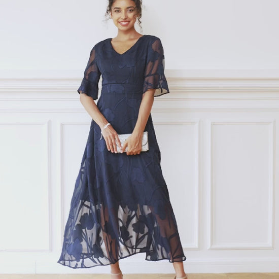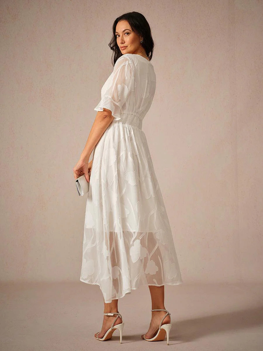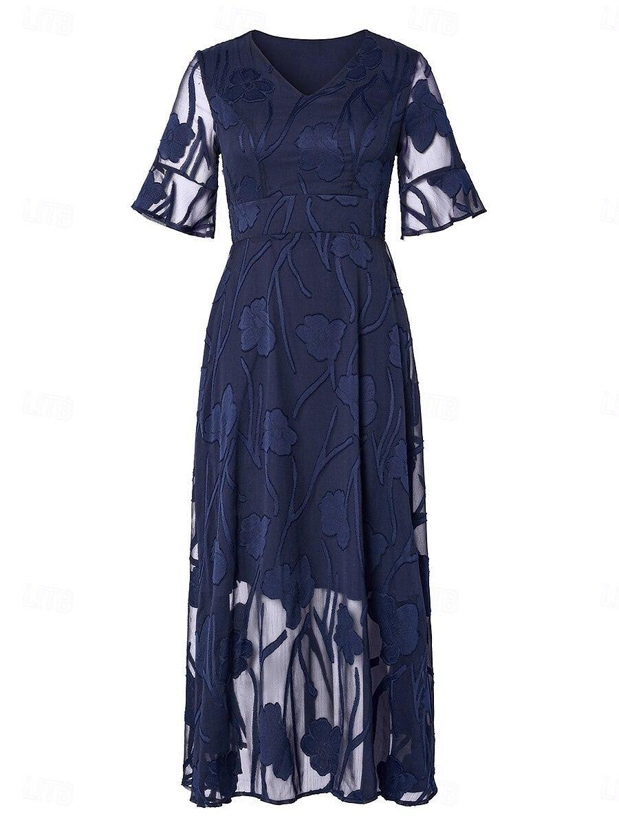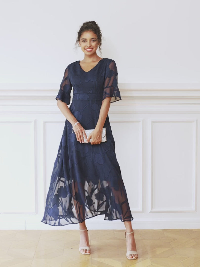 Bu dantel elbise, zarafetiyle dikkat çeken bir görünüm sunar. Düğün davetleri veya kokteyl partileri için ideal bir tercih olan elbise; zarif V yaka kesimi ve yumuşak uçuşan kollarıyla klasik bir şıklık sunar. A kesim silueti ve ince fırfır detayları ise elbiseye zarif ve feminen bir dokunuş katar.