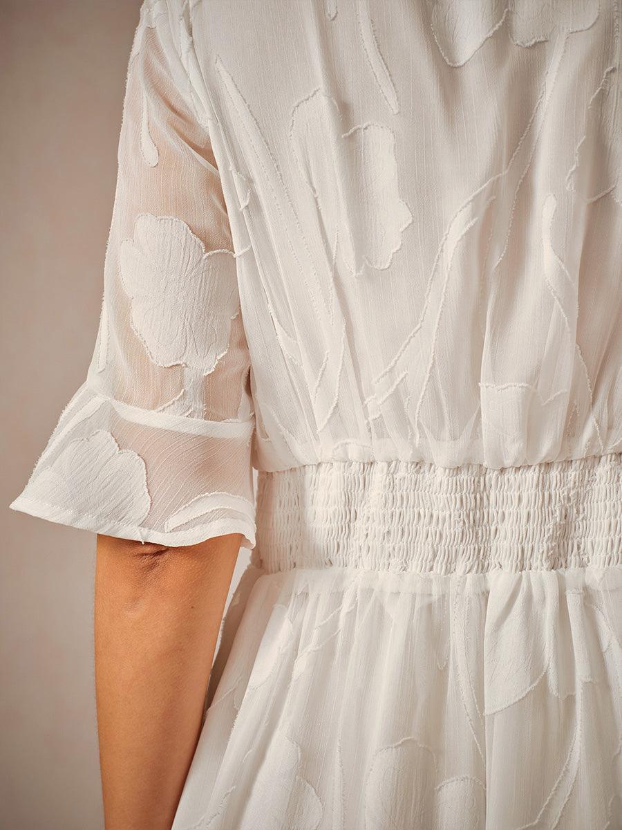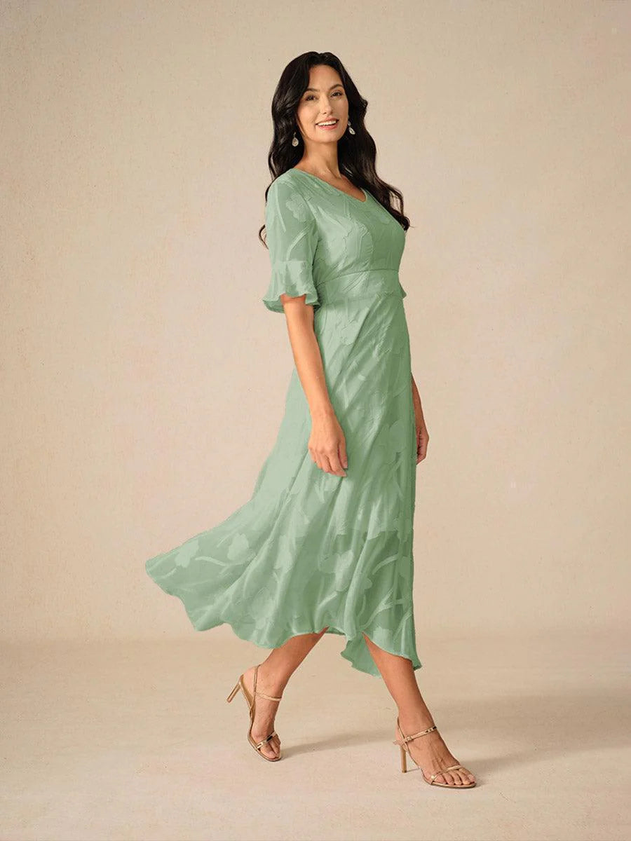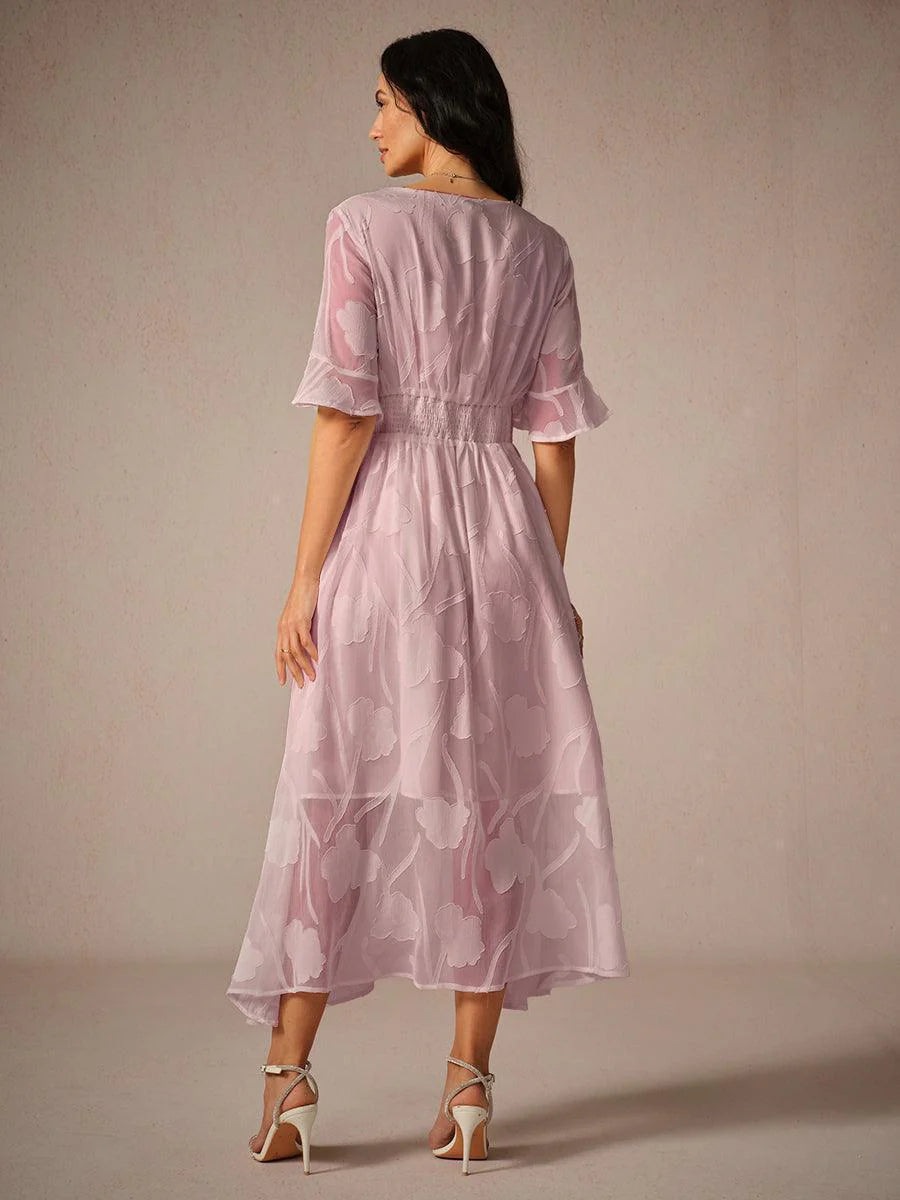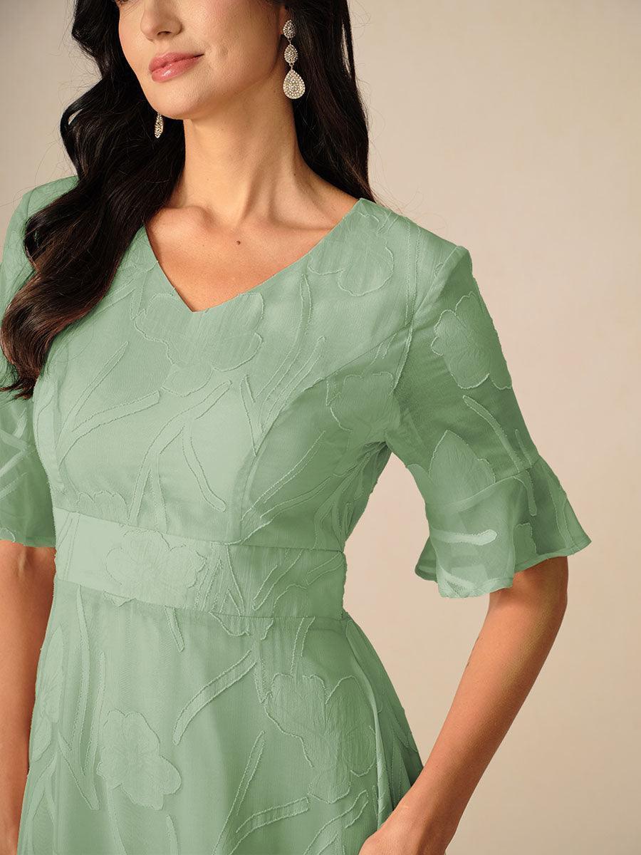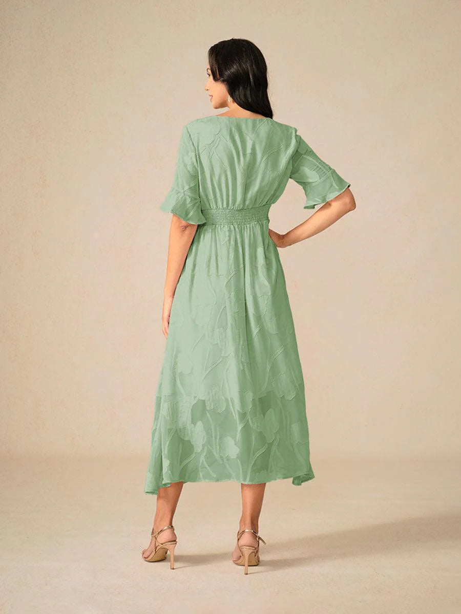 Bu dantel elbise, zarafetiyle dikkat çeken bir görünüm sunar. Düğün davetleri veya kokteyl partileri için ideal bir tercih olan elbise; zarif V yaka kesimi ve yumuşak uçuşan kollarıyla klasik bir şıklık sunar. A kesim silueti ve ince fırfır detayları ise elbiseye zarif ve feminen bir dokunuş katar.