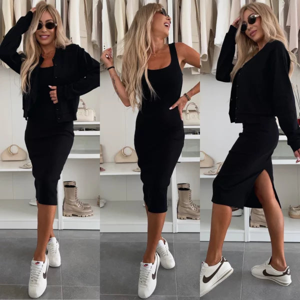 ️ 2’si 1 arada kombin: Uyumlu fitilli elbise ve ceket – güne hazır stil, zahmetsizce.