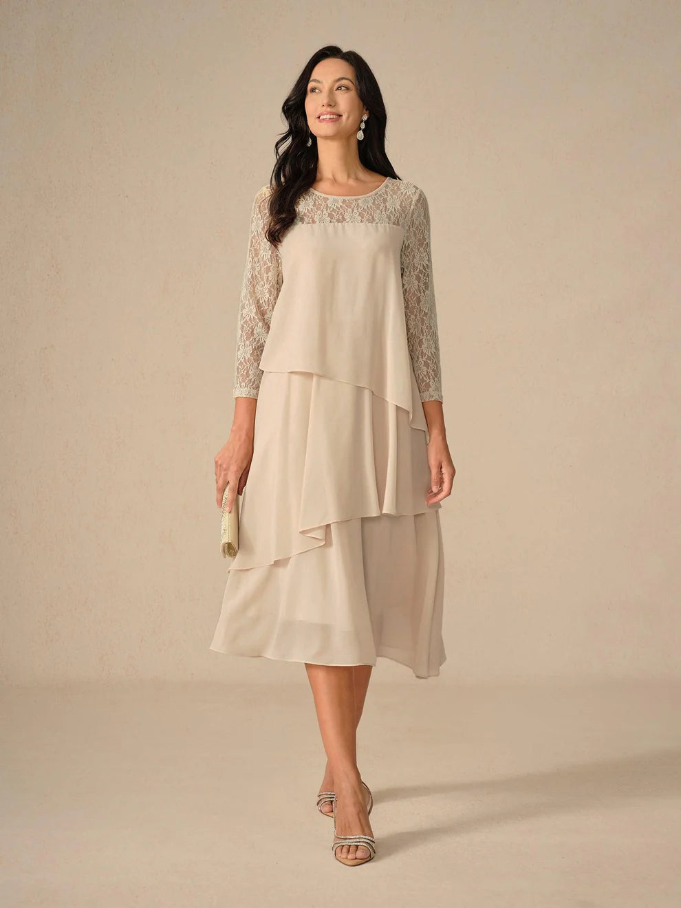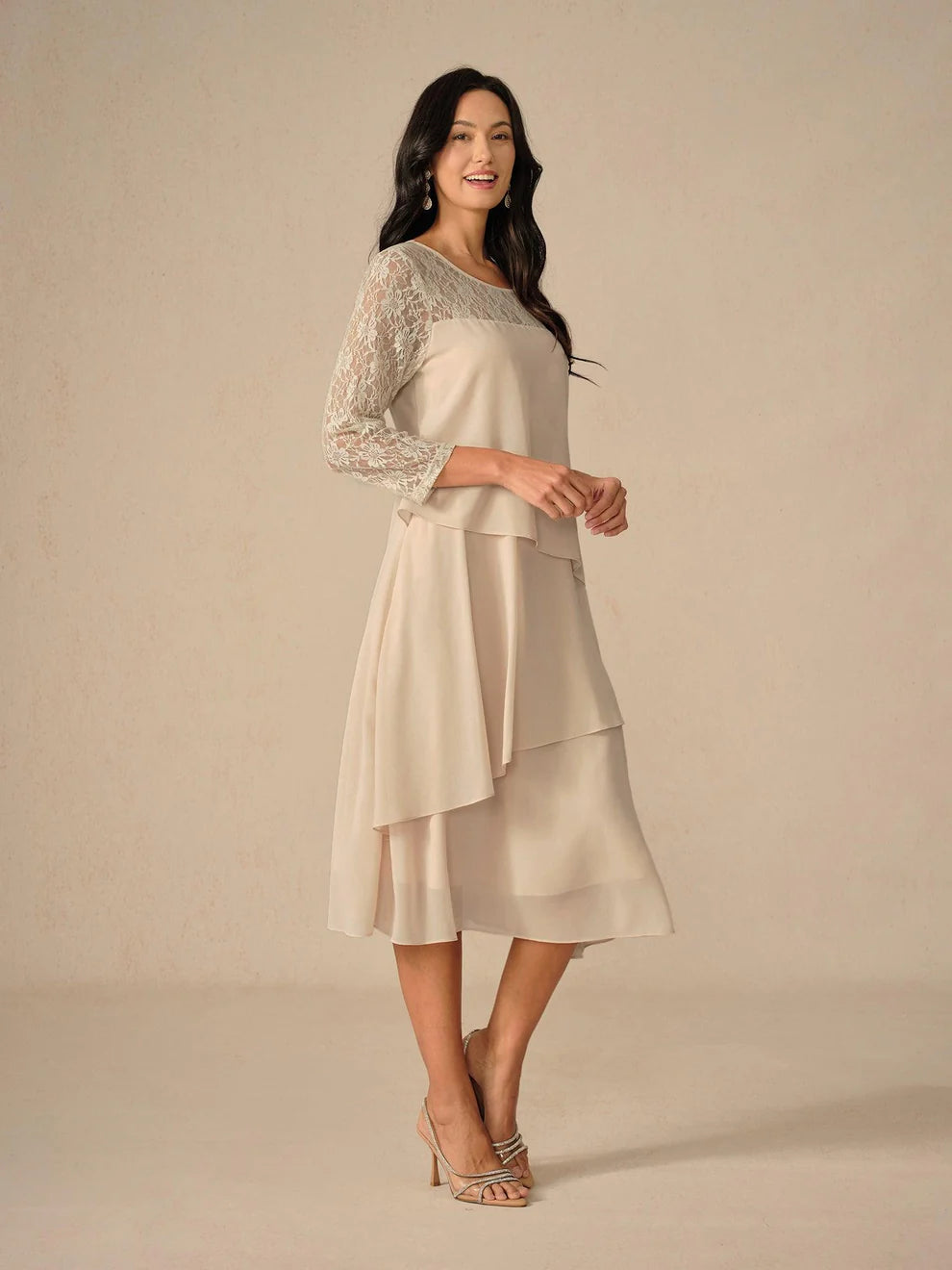 Bu zarif elbise, düğünlerden partilere kadar her ortam için ideal. Hafif şifon kumaştan üretilen model, şık ve konforlu bir kullanım sunar. Bisiklet yaka kesimi ile ferah bir duruş yakalayan elbise; özgün fırfır ve katmanlı dantel detaylarıyla her adımda sofistike bir hava katar.