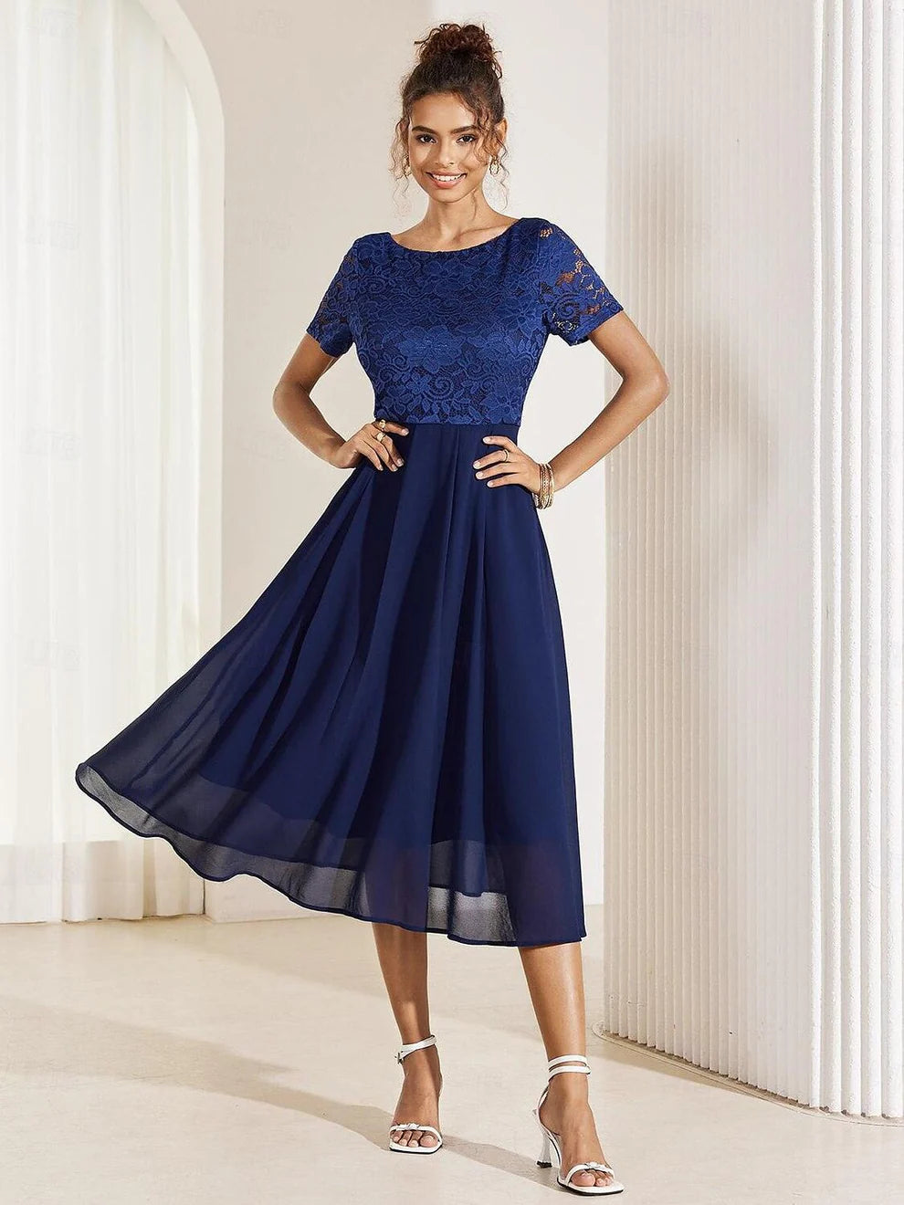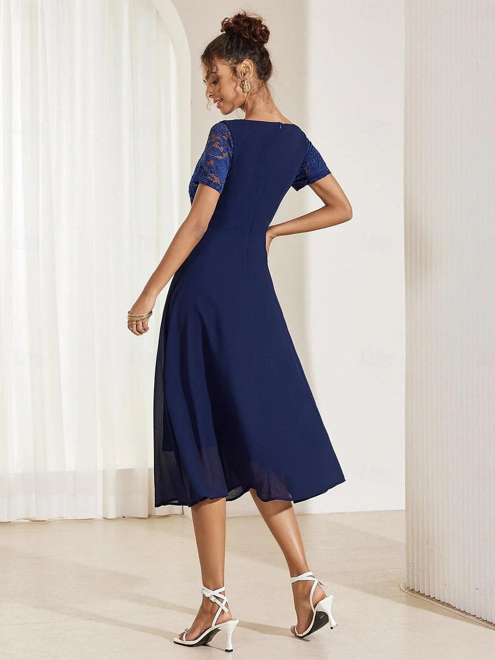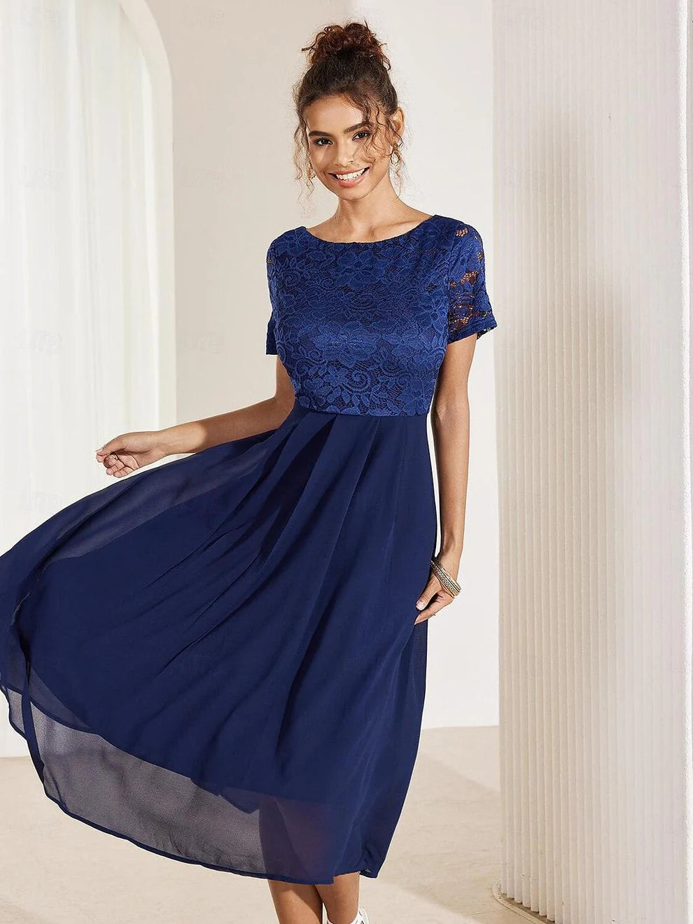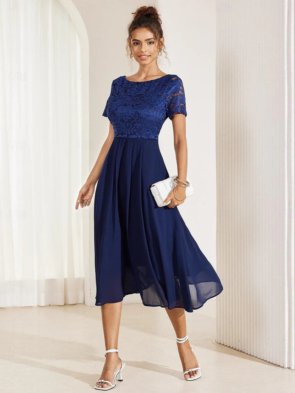 Bu zarif A kesim elbise, hafif şifon kumaştan üretilmiş olup düğün davetlileri ve kokteyl partileri için idealdir. Kontrast dantel detayları ve fırfır etek ucu, sofistike bir dokunuş katarken; bisiklet yaka ve midi boyu, şık ve rahat bir görünüm sunar. Yaz aylarının sıcak günlerinde bile ferah kalmanızı sağlayan bu resmi model, zarafet ve stilin mükemmel birleşimini yansıtır.