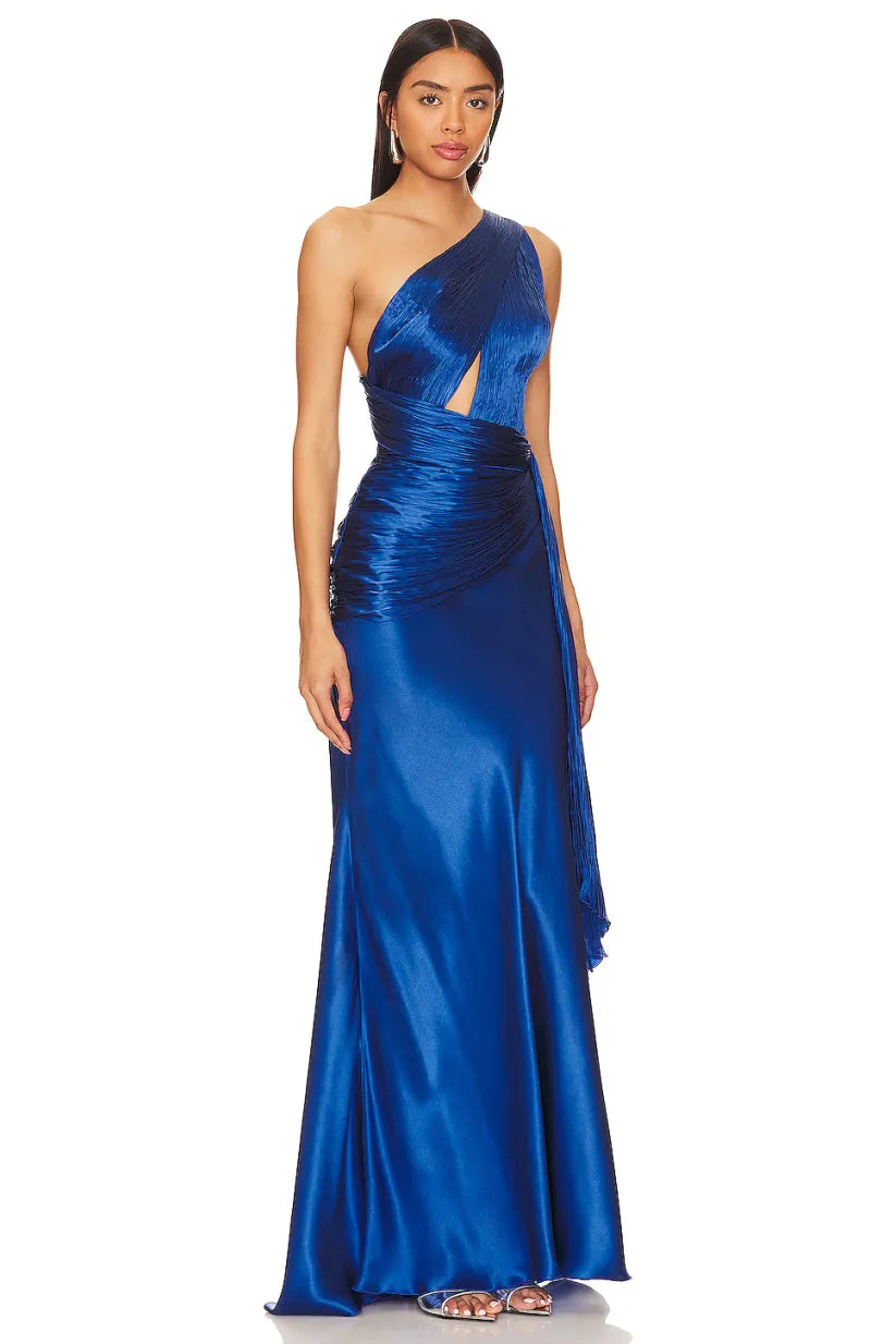 Düz mavi renk, tek omuzlu, kesik detaylı, kolsuz, maxi elbise.